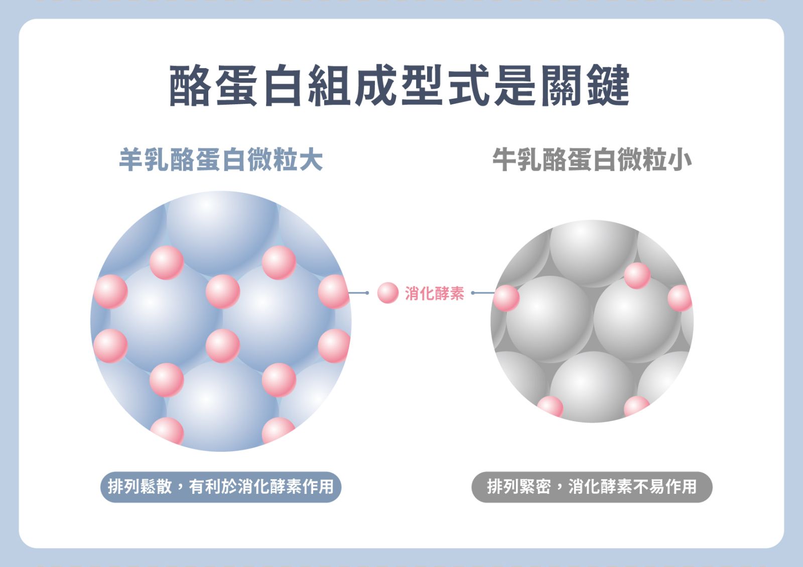 羊奶的酪蛋白以β酪蛋白為主(約佔70%左右),β酪蛋白的特點是含有高比例的脯胺酸,分子呈現比較不定型,而且結構鬆散,所以羊奶的酪蛋白微粒體積較大,微粒子之間的空隙也相對較大,消化酵素比較容易進入,對消化酵素分解能力當然有很大的幫助。