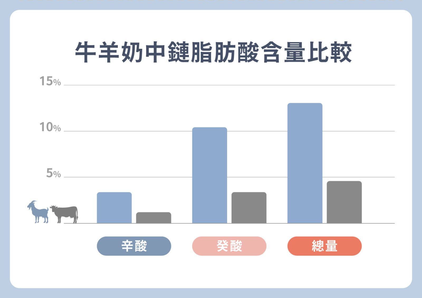 羊奶脂肪中,含有高比例(10~20%)的中鏈脂肪酸(例如辛酸與癸酸),不須經膽鹽乳化,就能快速提供寶寶熱量補給。